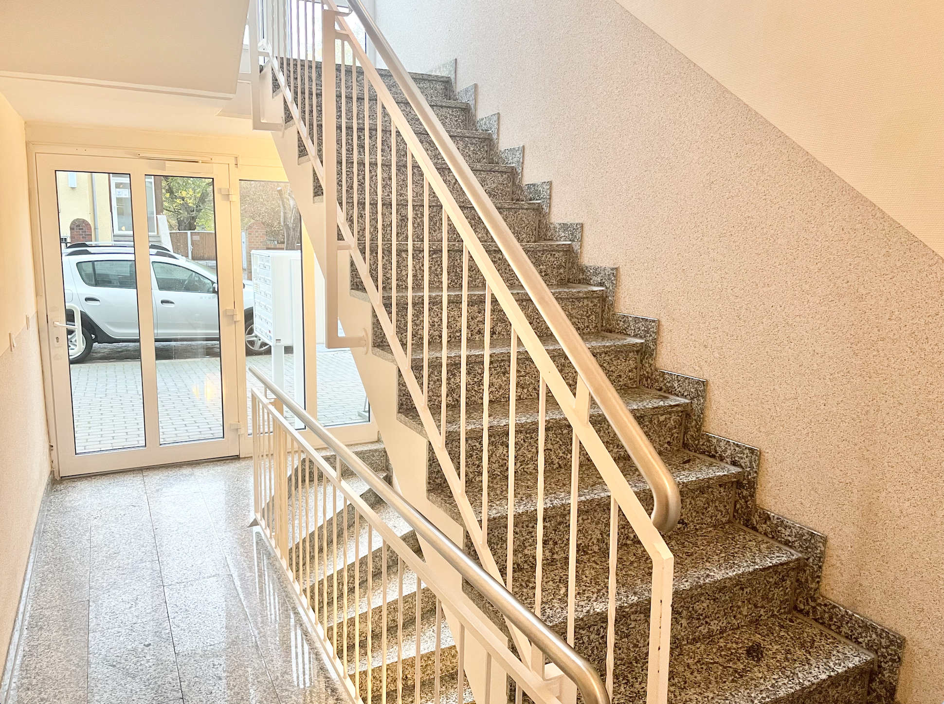 Sie befindet sich in der Bismarkstraße 28b, im zweiten Obergeschoss eines gepflegten Mehrfamilienhauses