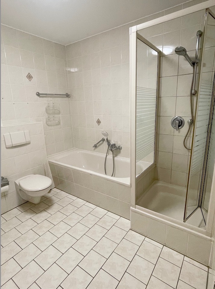 ein ca. 7qm Bad mit Dusche und Badewanne und Waschmaschinenanschluss,